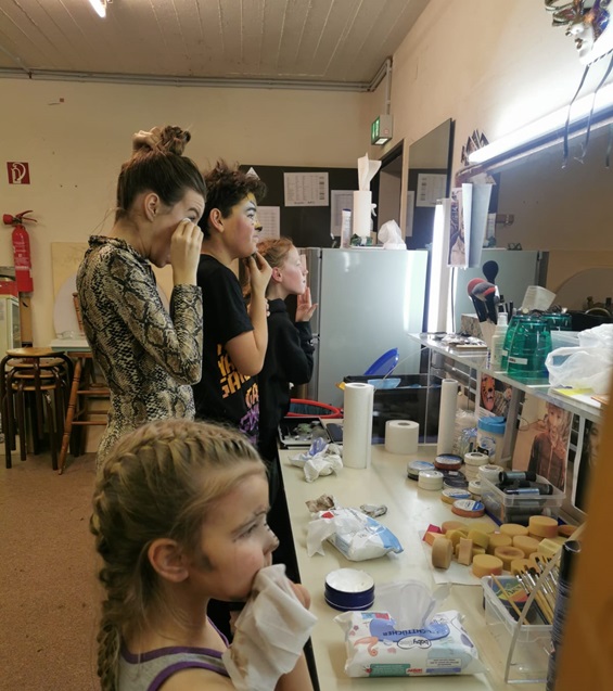 Scheinwerferlicht macht blass und lässt die Haut glänzen. Beide Effekte sind unerwünscht, wenn es um eine gelungene Darstellung geht. Wann immer ein Spieler auf die Bühne geht, ist er vorher in der Maske gewesen. Dort erhält jeder zumindest die Minimalbehandlung: Grundierung im passenden Hautton und Puder. Damit die Augen trotz des hellen Bühnenlichts ausdrucksstark sind, bekommen auch die männlichen Schauspieler eine zarte Linie von dunklem Kajal. Zum Schluss wird abgepudert, um den Glanz zu nehmen. Bei den Schauspielerinnen fällt die optische Behandlung vor der Vorstellung naturgemäß deutlich üppiger aus. Da müssen zusätzlich teils aufwendige Frisuren gestylt werden. Ein Stück, das in den 60er Jahren spielt, verlangt nach toupierten Haaren, eines aus den 80ern nach Fönfrisuren. Selbst wenn jemand eine sehr ungepflegte Person verkörpert, liegt das Aussehen in der Hand der Maske. Ein blaues Auge hier, eine Verletzung dort, deutliche Falten im Gesicht – alles eine Frage der Farbe. Besonders bunt treiben es die Künstlereinnen von der Optik bei den Kinderstücken. Ein echtes Sams? Kein Problem. Der Kopf einer Schildkröte, Schlange oder eines Tigers sind da schon aufwendiger. Prinzessinnen oder Menschen aus einem fremden Land aus den jungen Darstellern zu zaubern, ist dagegen einfach. Die Fantasie der Farben macht aus jedem Darsteller das, was die Zuschauer davon erwarten. Die Maske lässt alle gut aussehen.